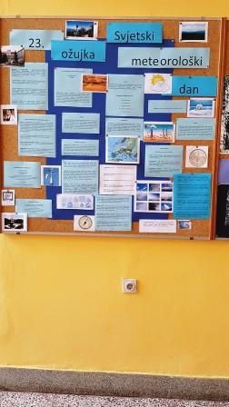 Svake godine u mjesecu ožujku obilježava se diljem svijeta Svjetski dan voda (22.03.) i Svjetski meteorološki dan (23.03.). Ove godine ti nama važni datumi poklopili su se sa tradicionalnom školom u prirodi „Pozdrav proljeću“. Nismo ih zaboravili prigodno obilježiti. Učenici GLOBE grupe i učenici petih razreda vrijedno su tijekom tjedna uređivali pano u predvorju škole da bi podsjetili ostale na važnost očuvanja voda i na značaj meteorologije u današnjem vremenu.