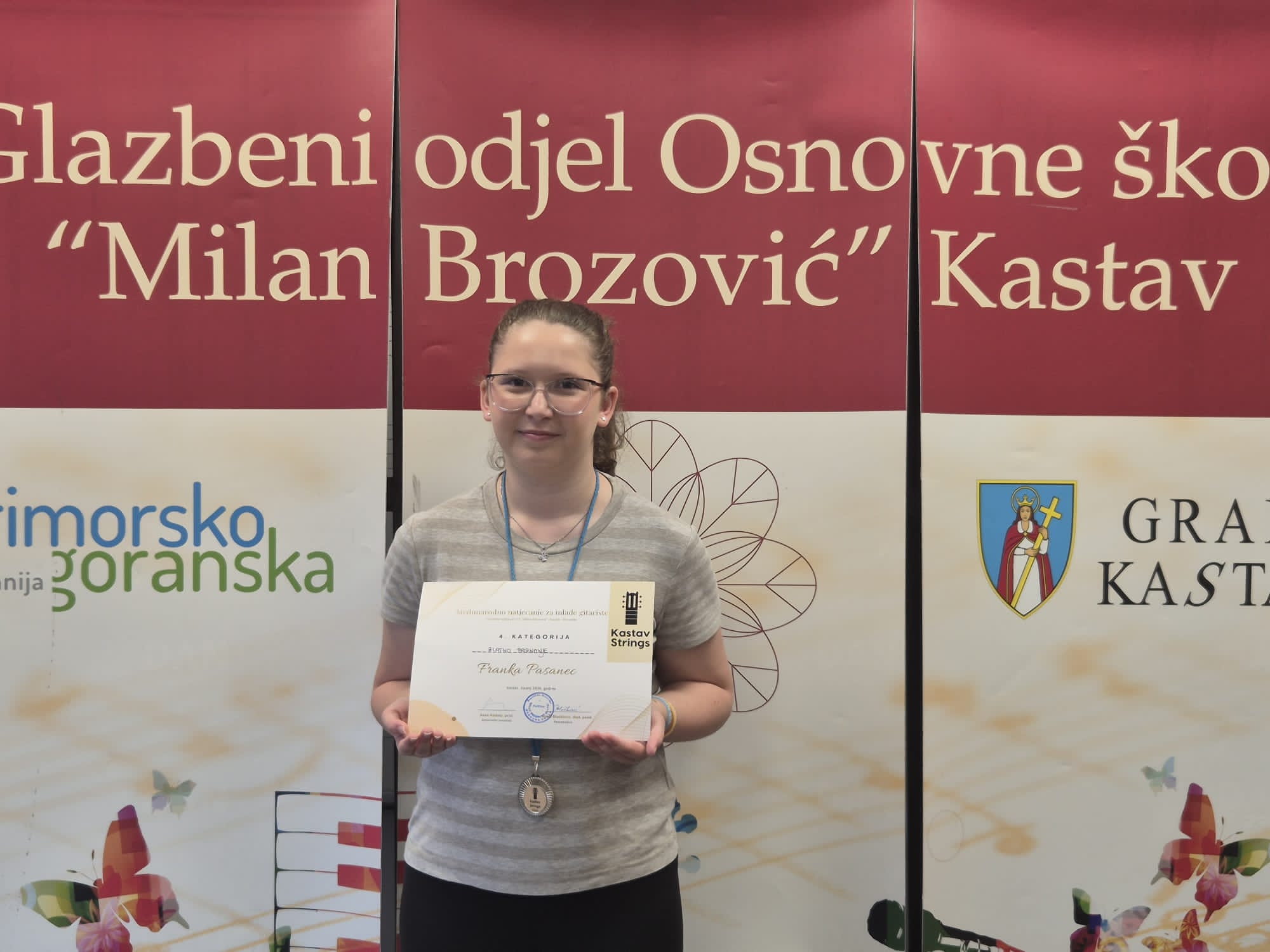 FRANKA PASANEC (4. raz. gitare), u klasi prof. Matije Ruka, sudjelovala je na na međunarodnom natjecanju "Kastav Strings" u Kastvu. gdje je osvojila zlatno priznanje u 4. kategoriji.